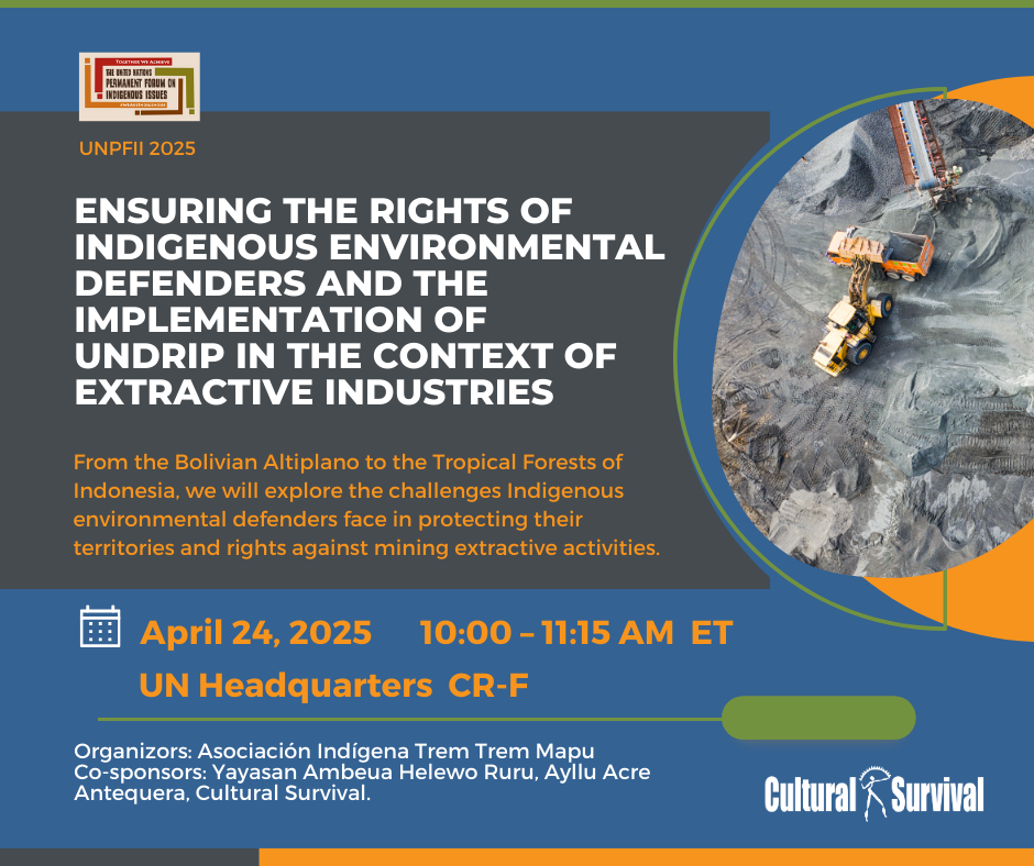 This side event will bring together Indigenous leaders, human rights experts, and civil society representatives to analyze the implementation of UNDRIP in different contexts and discuss effective strategies to ensure free, prior, and informed consent (FPIC). We will also address the risks faced by environmental defenders and the urgent need to strengthen protection mechanisms against threats and criminalization. From the Bolivian Altiplano to the Tropical Forests of Indonesia, we will explore the challenges Indigenous environmental defenders face in protecting their territories and rights against mining extractive activities.
