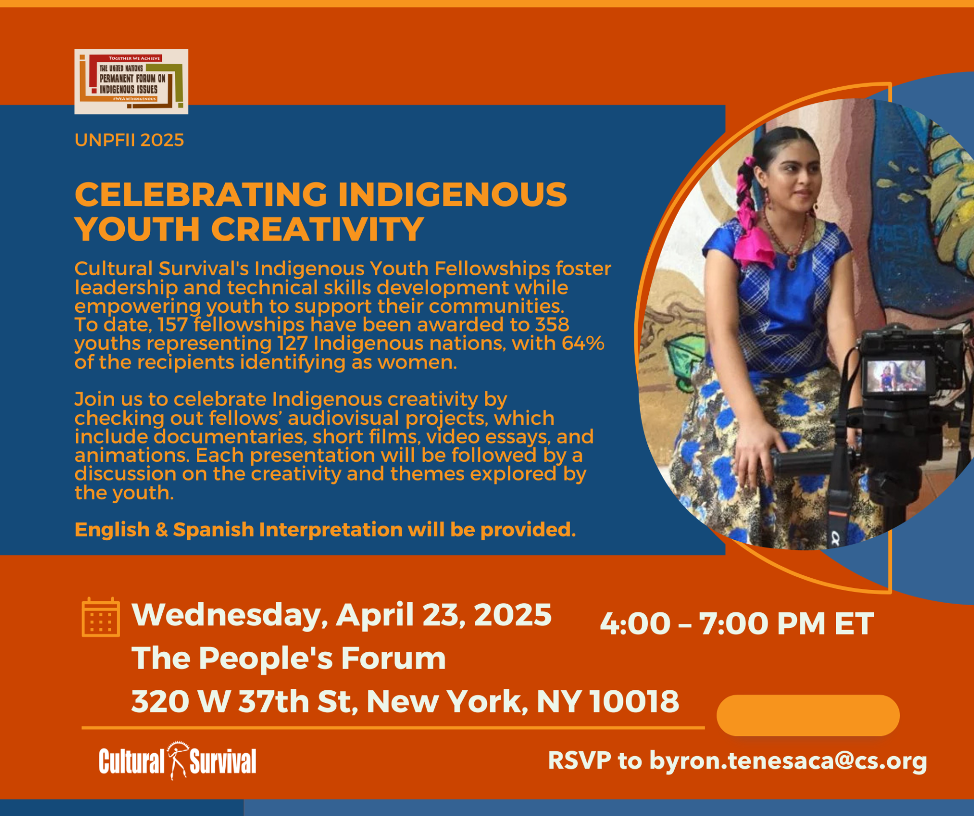 The Secretariat of the Permanent Forum (SPFII) and the Department of Global Communications (DGC), in partnership with Cultural Survival, is organizing an Indigenous Media Zone during the 24th session of the Permanent Forum in 2025. This will allow Indigenous media, journalists and platforms an opportunity to report on the session through Indigenous worldviews, perspectives and languages and organize media events around the theme of the session – “Enhancing Indigenous Peoples’ right to self-determination in the context of the United Nations Declaration on the Rights of Indigenous Peoples: emphasizing the voices of Indigenous youth”. Non-indigenous media are also welcome to join the Indigenous Media Zone. Further, in line with the International Decade on Indigenous Languages, the Indigenous Media Zone will aim to encourage the participation of Indigenous media practitioners in a wide variety of Indigenous languages from different regions. Several panels and interviews will be livestreamed on facebook.com/culturalsurvival.