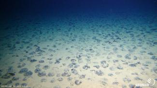 Top photo: Pollymetallic nodules on the bottom of the Clarion-Clipperton Zone seafloor. Credit: Wikimedia, Mister Pommeroy.