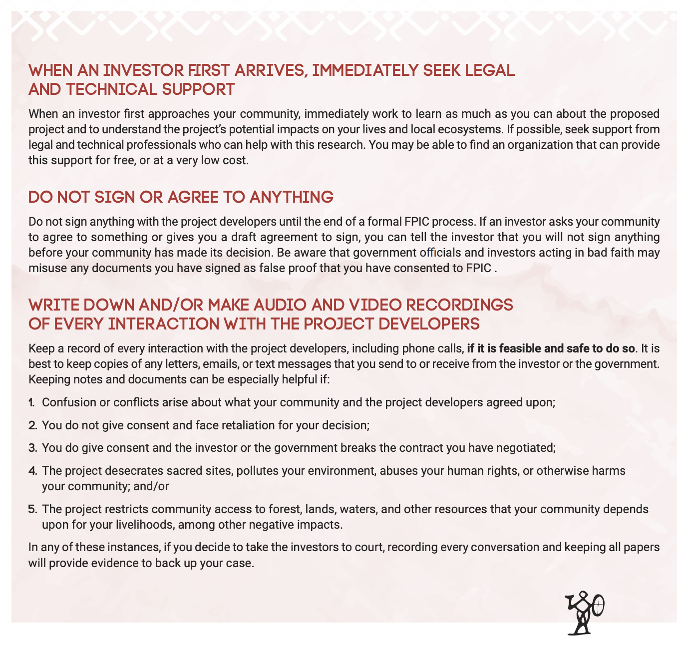 The second section of the FPIC guide provides recommendations such as taking the time to understand your legal rights, drafting your own FPIC protocols, creating a plan for addressing differing opinions within your community, and defining your vision of a strong community that is ready for investors when they seek your resources. For example, when an investor approaches your community, it’s essential to immediately learn as much as you can about the proposed project and take all potential implications into account. Make sure you have information on how the project can impact the lives of your community, your environment, and your resources. It’s best to seek support from legal and technical professionals which you can try to find from an organization at a free or low cost.