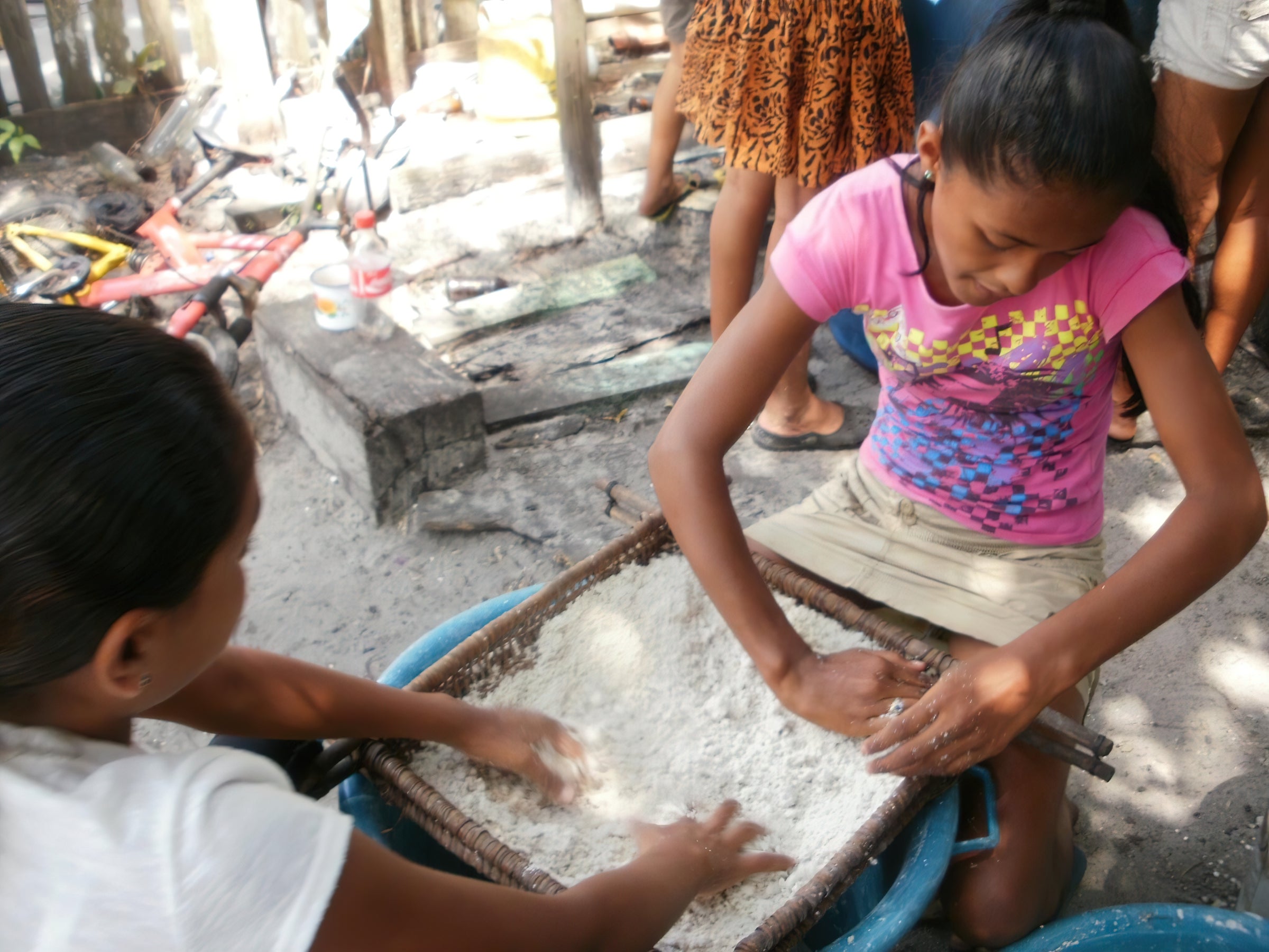 Photo: Sabantho Aderi sifts strained cassava pulp granules before they are baked into a flat, unleavened bread.